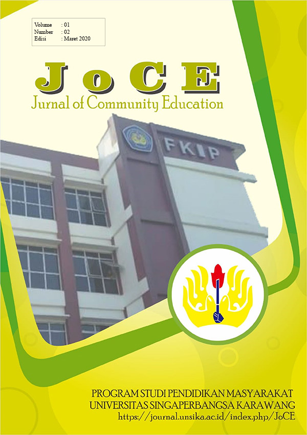 Vol. 1 No. 1JoCE (Journal of Community Education) (ISSN:2745-7907) adalah jurnal yang diterbitkan oleh Program Studi Pendidikan Masyarakat, Fakultas Keguruan dan Ilmu Pendidikan, Universitas Singaperbangsa Karawang. Jurnal ini bekerja sama dengan Himpunan Akademisi dan Program Studi Pendidikan Masyarakat Indonesia (HAPPENMASI) dan Ikatan Akademisi Pendidikan Non Formal Indonesia (IKAPENFI)