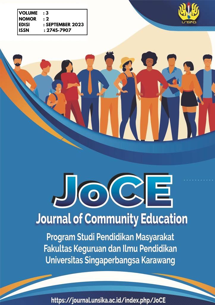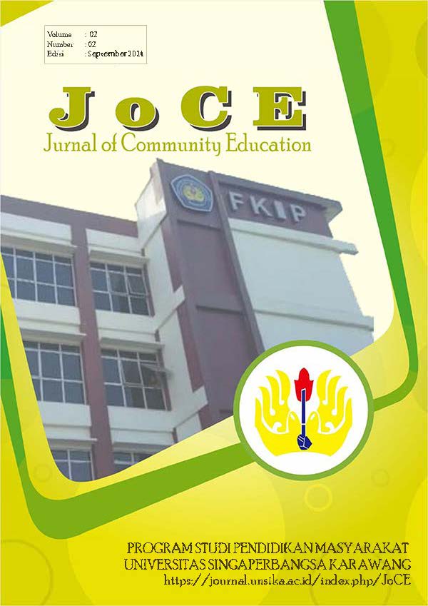 Vol. 5 No. 2 (2025)JoCE (Journal of Community Education) (ISSN:2745-7907) adalah jurnal yang diterbitkan oleh Program Studi Pendidikan Masyarakat, Fakultas Keguruan dan Ilmu Pendidikan, Universitas Singaperbangsa Karawang. Jurnal ini bekerja sama dengan Himpunan Akademisi dan Program Studi Pendidikan Masyarakat Indonesia (HAPPENMASI) dan Ikatan Akademisi Pendidikan Non Formal Indonesia (IKAPENFI)