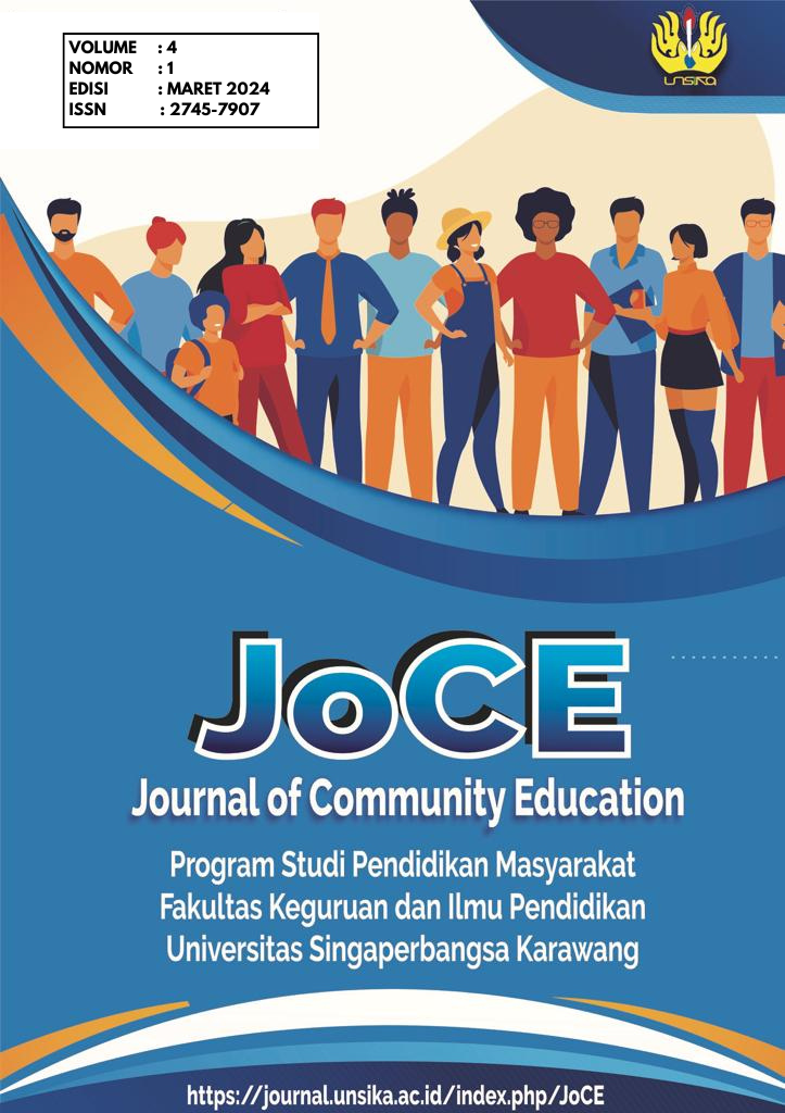 Vol. 5 No. 1 (2025)JoCE (Journal of Community Education) (ISSN:2745-7907) adalah jurnal yang diterbitkan oleh Program Studi Pendidikan Masyarakat, Fakultas Keguruan dan Ilmu Pendidikan, Universitas Singaperbangsa Karawang. Jurnal ini bekerja sama dengan Himpunan Akademisi dan Program Studi Pendidikan Masyarakat Indonesia (HAPPENMASI) dan Ikatan Akademisi Pendidikan Non Formal Indonesia (IKAPENFI)